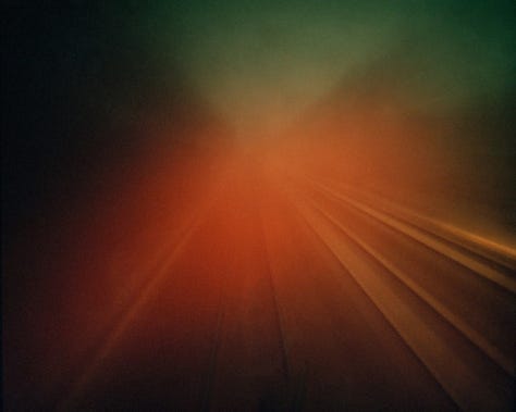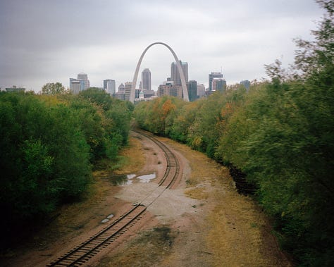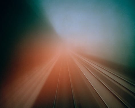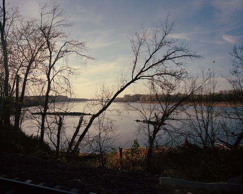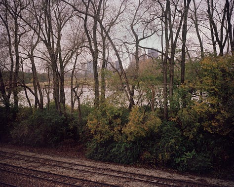 In the pictures that Evans makes, the train car becomes an inflection point between the present and the future, or a physical or metaphorical interzone that evokes feelings of ambiguity or unease. These spaces, so familiar they border on forgettable, still evoke a sense of dread. For Evans, the train car is a blank slate to project the myriad visions he has composed. Empty seats bathed in golden sunlight. An older woman smiling as the baby she holds in her arms touches her face. A balding man in a three-stripe Polo shirt stares at nothing while getting lost in his thoughts. These projections extend beyond the train car too. A prismatic orb floating above iron rails and wooden crossties. Skeletal trees bent like spines along riverbanks. Monuments in mist seen at a distance.