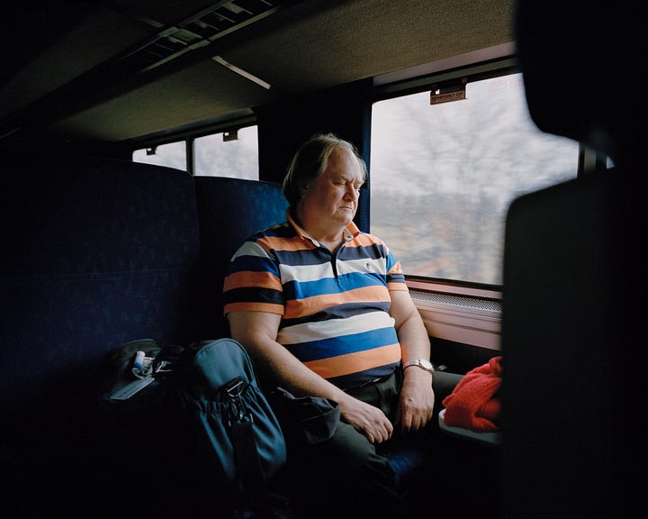 “Train interiors are inherently liminal spaces,” Evans explains. “While the passengers change, the backdrop stays the same. The effect is democratizing. People shown in the same space—separated from their environments and possessions—hanging between departure and destination.”