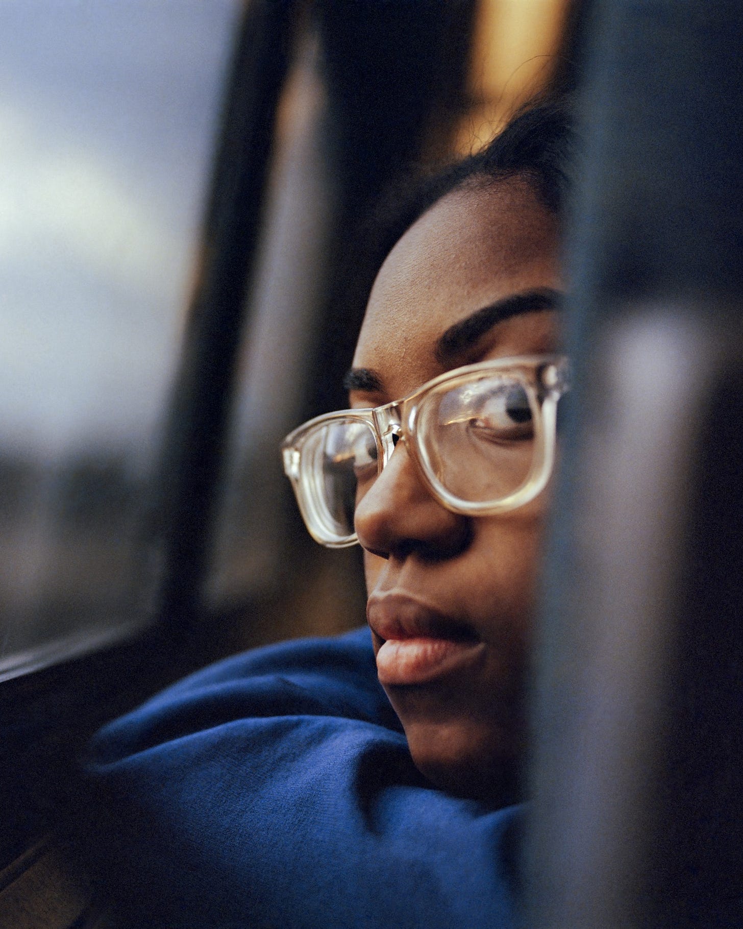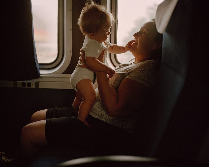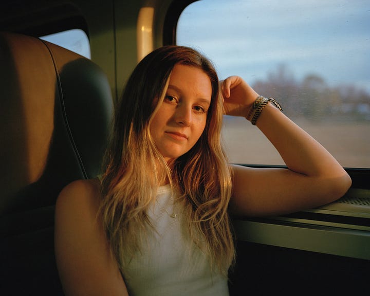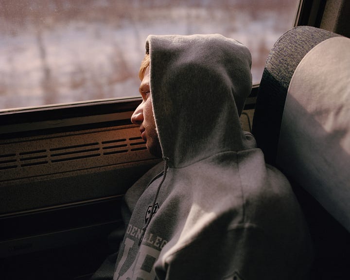 This portrait, part of photographer McNair Evans’ drawn inward series—which invites train passengers to write why they are traveling, where they are coming from, and where they hope to go—was taken in December 2024, several days before Christmas. A few months earlier, Jada had reunited with family members and was invited to visit during the holidays. When Evans met her, the train was crossing the Virginia border into North Carolina, and he made two portraits. In the first, Jada cradles her chin in her left hand while her blue nail polish mirrors the color of her shirt, yet her face is out of view. It is an ambiguous image, malleable and untethered without its pair. The second is the portrait where Jada turns to look behind her, an honest intensity in her eyes. She wants to help people, she writes in the last sentence of her journal entry, by working as a therapist for children and adults. Apart, the pictures act like pregnant pauses, so much weight between them. Together they are a sequenced encounter, a closed loop.